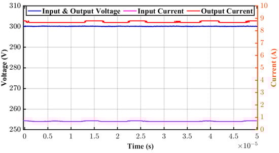 According to the full-load setup in Figure 17, the and along with the input and output currents were measured, as shown in Figure 21. The and were both 300 V, while the output current was achieved about 8.79 A, and input current, which was used to supply the converter losses, including the 3P-HFT and power semiconductor switches losses, was 0.72 A. Therefore, the total power from the DC power supply was about 216 W, which was considered to be the total converter losses, and according to the measured core and copper losses of the 3P-HFT, the total 3P-HFT loss was about 34.115 W, which indicated that the transformer efficiency was 98.67%, and the converter efficiency was measured to be about 92.43%.