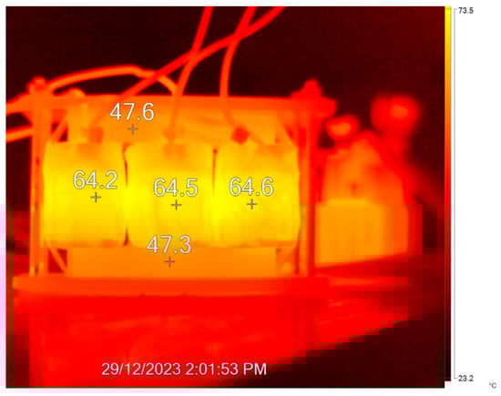 The converter was operated under a full load for 20 min and a FLUKE Ti401 PRO Thermal Imager was used to measure the temperature of the proposed 3P-HFT. Figure 22 shows that the highest recorded temperature of the 3P-HFT was approximately 64.6 °C at a steady state point. The temperature distribution among the core limbs of the transformer was seen to be even because of the distribution of inside the transformer limb, which resulted in similar core losses within the core limbs. Compared with the calculated temperature without air gaps, the total 3P-HFT temperature was reduced by 3.33 °C due to the reduction in the overall B and core loss brought about by the designed air gaps.