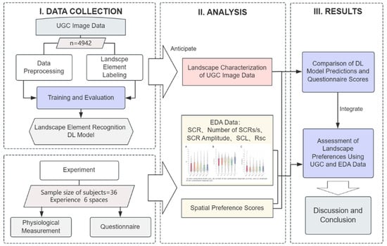 Recognizing the limitations of traditional research methods’ lack of generalizability and objectivity, this study uses the UGC-based DL model to fuse physiological experiments and combines them with the results of subjective questionnaires to further explore users’ landscape perception preferences. Therefore, this method is expected to provide more comprehensive and reliable results than traditional studies. In this section, the model prediction data and experimental data generation process is detailed, including a description of the material acquisition and research methodology steps taken in order to lay the foundation for data analysis, as shown in the methodological flow chart (Figure 1).
