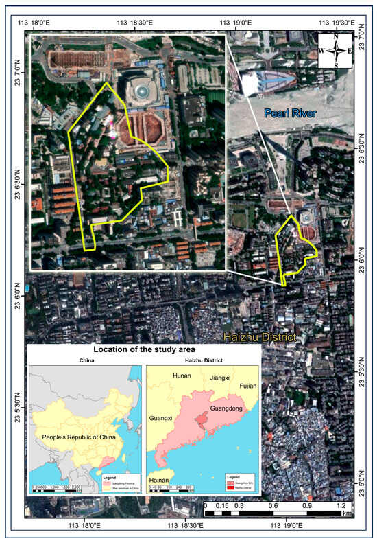 The TIT Textile and Garment Cultural and Creative Industrial Park, situated in the Haizhu District of Guangzhou, Guangdong Province, serves as the focal point of this research (Figure 2). Spanning 75,000 m2, with a total building area of approximately 40,000 m2, the park is strategically positioned along the city’s new central axis and in proximity to the Guangzhou TV Tower. Its predecessor is the Guangzhou Textile Machinery Factory, which was established in 1956. It has developed into a vibrant cultural and creative center, guided by the theory of sustainable development. This transformation of abandoned industrial parks using the principles of sustainable development makes a significant contribution to the economy, society, and culture of the city, positioning the TIT Creative Park as an exemplary model for the conservation and utilization of industrial legacies.
