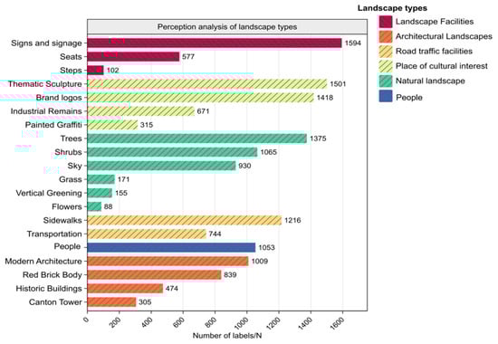 By filtering confidence scores and retaining between 1 and 10 landscape element labels per image, a total of 15,620 labeled data points were obtained, averaging approximately 7.81 labels per image. The perceptual recognition frequencies of the 20 landscape elements were then calculated by determining the proportion of each element within the overall dataset (Figure 3).