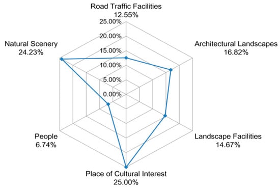 Analysis of the recognition frequency revealed that “signs and signage” had the highest frequency (1594 occurrences), indicating that it is the most prominent landscape element perceived within TIT Creative Park, reflecting a strong preference among visitors. This high recognition can be attributed to the presence of numerous notable enterprises in the park, where signs and signage play a crucial role in brand promotion and identity creation, serving as visually appealing symbols that attract visitors for photography and exploration. Similarly, the landscape element “themed sculptures” exhibited a high perception frequency (1501 occurrences). Themed sculptures, often featuring engaging cartoon imagery, enhance brand tangibility and foster emotional connections, thereby encouraging visitors to engage more deeply with the brand’s offerings.