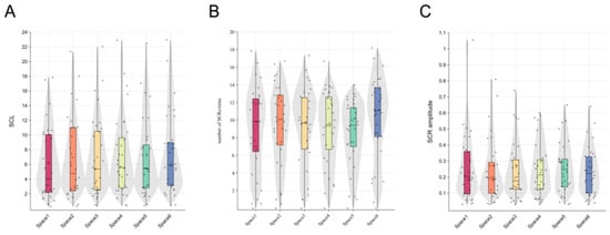 (A) Skin conductance levels (µS), (B) number of skin conductance responses (n/mins), and (C) amplitude of skin conductance response (µS).