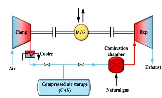 A schematic representation of a storage system for compressed air, where Comp—compressor; M/G—Motor/Generator; and Exp—Expander. Reproduced with permission from Zhou et al. (2019) [19], ©Elsevier, 2019.