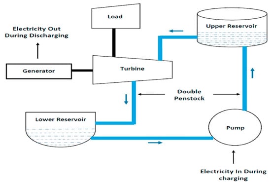An illustration of a pumped hydroelectric system. Reproduced with permission from Rehman et al. (2015) [23], ©Elsevier, 2015.