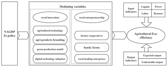 Moreover, the NAGDPZs policy actively supports rural entrepreneurship by encouraging the development of new agricultural business models, such as circular agriculture and integrated crop-livestock systems. It also prompts the establishment of new agriculture entities, including farmer cooperatives, family farms, and rural leading enterprises, which are crucial for scaling up operations and adopting green production models. In addition, the policy provides financial and policy support through subsidies, land-use guarantees, and financial services to encourage these new entities to adopt environmentally friendly practices. These initiatives help transform traditional agricultural practices and foster rural entrepreneurship, driving regional AEE improvements by integrating economic growth with ecological sustainability [53,54] (as exemplified in Figure 1). Building upon these insights, the other two hypotheses of this paper are formulated: