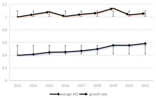 Figure 2 illustrates that, with 2013 as the base year, the average AEE and its growth rate across the counties of Hubei Province steadily increased from 2014 to 2021. Average AEE rose from 0.398 in 2013 to 0.583 in 2021. The growth rate exceeded 1 annually but exhibited periodic fluctuations, indicating ongoing enhancement in the agricultural green development capacity and standards across county areas in Hubei Province. However, there are disparities in the time required and challenges faced in further improving AEE, which align with the practical conditions of different regions.