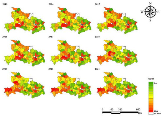 Spatiotemporal distribution of counties’ AEE in Hubei Province.