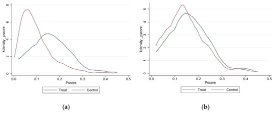 Figure 8. (a) Kernel density distributions before comprehensive matching and (b) kernel density distributions after comprehensive matching.