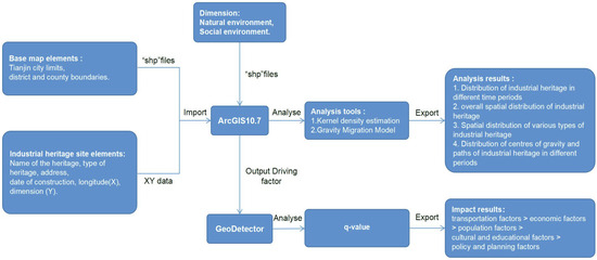 This study investigated the distribution patterns and underlying historical causes of shifts in the distribution of Tianjin’s industrial heritage utilizing ArcGIS as the primary analytical tool, complemented by statistics and supported by corroborative historical evidence. The analysis procedure used in this study [24] is shown in Figure 2. Initially, geographic coordinate data of industrial heritage sites were gathered and imported into ArcGIS, facilitating the conversion of these coordinates into a point layer. This process enabled the creation of a density map, visually representing the concentration of heritage across various regions. Subsequently, the industrial heritage data were organized chronologically by year or time interval, with ArcGIS’s “Geoprocessing Tools” utilized to calculate centroids for each period, thereby illustrating their migration paths over time. Additionally, the spatial data were prepared for analysis using the “Standard Deviation Ellipse” tool, which effectively captured the center, major axis, and minor axis of the ellipse, reflecting the direction and extent of spatial distribution. Environmental factors influencing the development of industrial heritage were also compiled and formatted to ensure compatibility with geographical detector analysis. An appropriate analysis area was selected to ensure a sufficient number of sample points, with environmental factors and target variables reclassified as necessary. The core algorithm of geographical detectors was then employed to calculate the “q value” for each environmental factor, allowing for the identification of the most significant influences. By quantifying the spatial distribution of industrial heritage alongside these environmental factors, this study established a robust empirical foundation for the protection and sustainable utilization of industrial heritage in Tianjin.