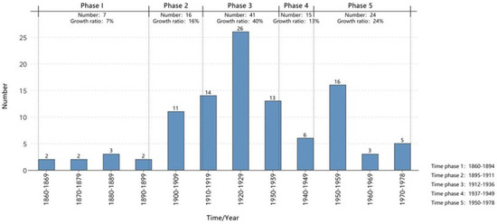 Tianjin’s industrial heritage can be segmented into five key phases [30], each defined by historical events that caused significant societal shifts, as follows: first phase (1860–1894), from the formal opening of Tianjin’s port to the Sino-Japanese War; second phase (1895–1911), from the rise of the Beiyang government to the initial years of the Republic of China; third phase (1912–1936), from the establishment to the prelude of the Anti-Japanese War under the Republic of China; fourth phase (1937–1949), from the comprehensive outbreak of the Anti-Japanese War to the inception of the People’s Republic of China; and fifth phase (1950–1978), from the founding of the People’s Republic to the commencement of the Reform and Opening-Up era. These periods were further analyzed in decade-long segments to discern the evolving patterns of Tianjin’s industrial heritage, as shown in Figure 3.