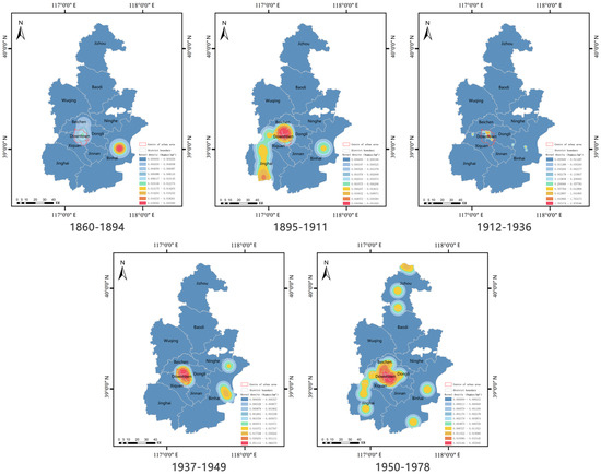 Kernel density distribution of Tianjin’s industrial heritage by historical periods.