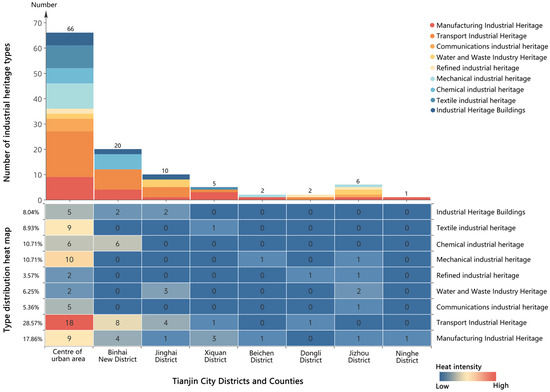 Distribution of industrial heritage by type in the view of Tianjin districts and counties.