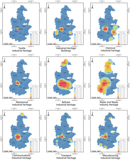 Figure 9 illustrates the distribution patterns of various types of industrial heritage in Tianjin, highlighting the density and directional trends of these heritage types throughout the entire geographic area of the city. From the perspective of the urban area of Tianjin, every category of industrial heritage is represented in Tianjin’s central region, where they collectively exhibit a pronounced clustered distribution.