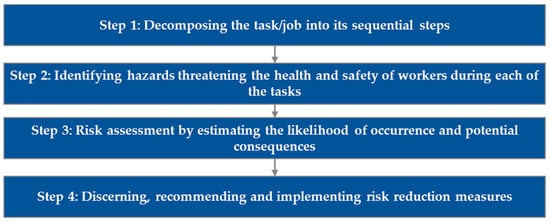A process for identifying and assessing work hazards before starting work is crucial for preventing accidents [24]. JSA can help identify and assess work hazards [25] and has been long used in various industries such as oil, construction, automation, mining, and shipbuilding [26]. In JSA, the task is divided into sequential steps, the hazards at each step are identified and assessed, and hazard risk mitigation measures are established [27]. Figure 2 depicts the JSA process currently implemented in Korea.