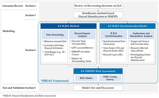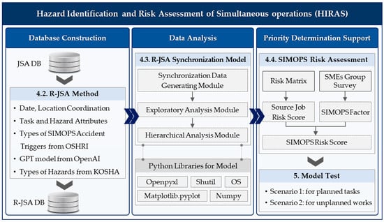 The HIRAS framework comprises three components: (i) the relation-oriented JSA (R-JSA) method, which generates the required data from JSA to build a database; (ii) the R-JSA synchronization model, which analyzes data to identify hazards during SIMOPS; and (iii) SIMOPS risk assessment (S-RA), which evaluates and prioritizes the identified risks. The components are detailed below.