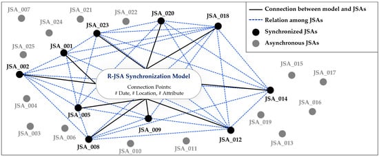 The Zettelkasten method builds a knowledge system wherein individual pieces of information are connected and integrated to generate new information [57]. The choice of connection points is crucial because connection points determine the generated information [57]. The SIMOPS information was generated by choosing the following connection points: date and location corresponding to the temporal and spatial attributes, respectively, were chosen as the connection points from individual JSAs; task and hazard attributes were chosen as the connection points to generate inter-task effects. JSAs are interconnected in the R-JSA synchronization model via the date, location, and attribute connections. A schematic of the R-JSA synchronization model with the Zettelkasten method is shown in Figure 4.