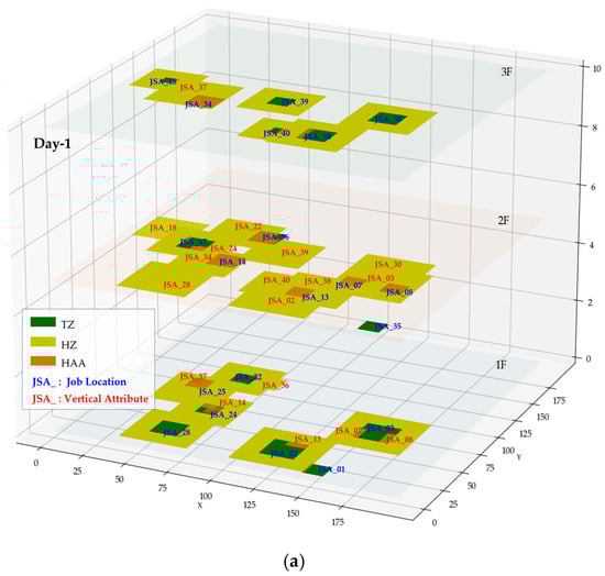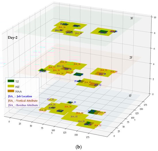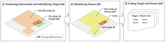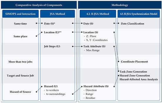 The connection points between the JSAs were chosen by matching the SIMOPS components and inter-task effects with the JSA components. The matched JSA information was converted into a form recognizable by the model via systematic structuring. Task locations were converted into coordinates, task attributes into ranges, and hazard attributes into direction, range, and residue. The details of this conversion are provided in Section 4.2. The converted information was used in the R-JSA synchronization model to model real-time SIMOPS situations by connecting information corresponding to the same date and floor, and SIMOPS-related hazards were identified. These aspects are detailed in Section 4.3. Figure 5 shows a schematic of the SIMOPS components used to develop the R-JSA synchronization model.