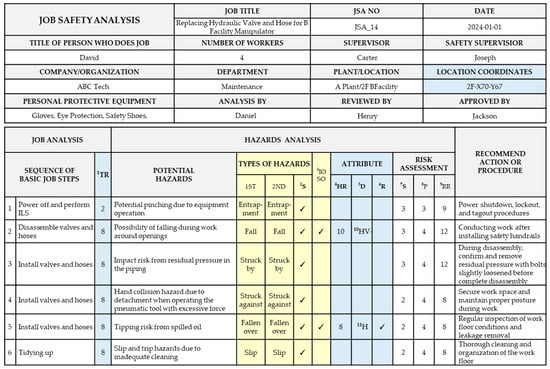 - Occupational Safety and Health Administration (OSHA), US Department of Labor. Job Hazard Analysis; Occupational Safety and Health Administration (OSHA), US Department of Labor: Washington, DC, USA, 2002. Available online: https://www.osha.gov/sites/default/files/publications/osha3071.pdf (accessed on 22 August 2024).