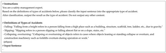 - Classification of disaster types: Disaster types were classified to structure the hazards corresponding to individual tasks. As classification criteria may vary across industries, the 22 criteria detailed by KOHSA were used herein [58]. The classification was conducted in three steps. First, the worker classified the types, and GPT was used to assist classification. The role, classification criteria, and output format were specifically presented in the GPT prompt. The GPT prompts were combined with JSA hazards using text concatenation functions in Google Sheets, and the GPT API was used for classification. Discrepancies between the two results were reviewed. The accuracy and reliability of the classification were improved by reviewing and supplementing the results provided by AI. Figure 8 shows a part of the prompt used for disaster-type classification.