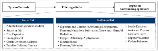 Figure 9. Criteria and process for selecting items with potential for SIMOPS accidents among disaster types. - Direction of the hazard: Four directions were considered: horizontal, horizontal and upper, horizontal and lower, and horizontal and both upper and lower. The same hazard can occur in different directions depending on the work environment. For example, in the case of a fire, the direction can vary depending on the exposure and composition of the space as well as the source of fire, such as gas or oil. Therefore, environmental factors were considered based on the worker’s domain knowledge.