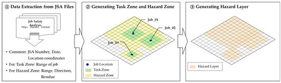 Research on hazard identification focuses on clear identification and rapid detection of potential hazards. Patrucco et al. developed the Computer Image Generation for Job Simulation method to effectively use JSA techniques. The method helped visualize worker activities in the workspace, and consequently, hazard identification was faster and more intuitive than that in traditional methods [46]. Zheng et al. proposed the Energy Source-Based Job Safety Analysis method for effective hazard identification. The method provided categories to identify hazards at each job step, and the total recordable incident rate was 50% lower than that in similar projects using traditional JSA [42].