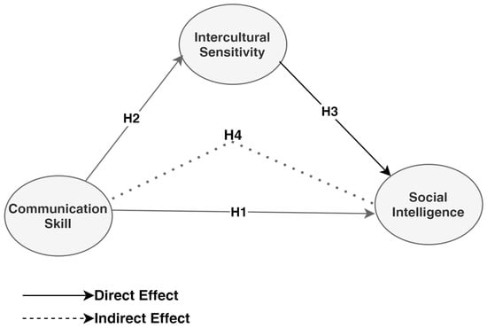 This research, which tries to determine the relationship of teacher candidates’ communication skills with their levels of intercultural sensitivity and social intelligence, was designed in relational screening model. Relational screening model is a research model in which the direction of the relationships between two or more variables is determined [56]. The relationships between the variables of the study were tested with the hypotheses developed by the researchers. The research model created according to the hypotheses was examined by structural equation modeling (SEM). The model of the study is given in Figure 1 (Straight lines indicate direct effect, dashed lines indicate indirect effect).