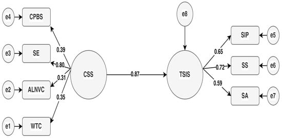 Structural equation model (SEM) was used to determine the research hypotheses and the mediation effect suggested by Baron and Kenny [69]. In this direction, path analysis model established for the hypothesis of “H1: Communication skills of teacher candidates predict their social intelligence levels positively and significantly.” is presented in Figure 2 (CPBS: Communication Principles and Basic Skills, SE: Self-Expression, ALNVC: Active Listening and Non-Verbal Communication, WTC: Willingness to Communicate, CSS: Communication Skills Scale; SIP: Social Information Process, SS: Social Skills, SA: Social Awareness, TSIS: Tromso Social Intelligence Scale).