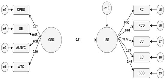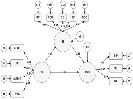 Since the first three conditions of Baron and Kenny [69] are met in order to determine the mediating role between the variables (see: Figure 2, Figure 3 and Figure 4), a model for the mediating role was created. For this reason, communication skills were included in the model as independent variables, intercultural sensitivity level as mediating variable, and social intelligence level as dependent variables. Figure 5 shows the path analysis established for the hypothesis of H4: “Intercultural sensitivity level has a mediating role in the relationship between teacher candidates’ communication skills and social intelligence levels” (CPBS: Communication Principles and Basic Skills, SE: Self-Expression, ALNVC: Active Listening and Non-Verbal Communication, WTC: Willingness to Communicate, CSS: Communication Skills Scale; RS: Responsibility in Communication, RCD: Respect for Cultural Diversity, CC: Confidence in Communication, EC: Enjoying Communication BCC: Being Careful in Communication, ISS: Intercultural Sensitivity Scale; SIP: Social Information Process, SS: Social Skills, SA: Social Awareness, TSIS: Tromso Social Intelligence Scale).
