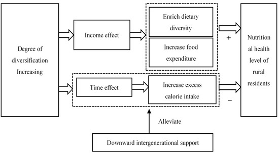 Furthermore, with rapid economic development in China, residents’ incomes are becoming increasingly diversified, leading to significant changes in their nutritional and dietary structures [25]. Previous studies have found that diversified income significantly affects household food consumption behaviors. Particularly in rural areas, increased diversified income can boost the consumption of various types of food, thereby enhancing dietary diversity [26]. As a key factor in healthy eating, improved dietary diversity is bound to enhance the nutritional health of rural residents. Based on this, Hypothesis 2 is proposed: