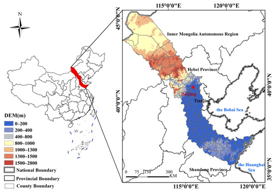 The transect we studied is situated in the north of China, between longitude 111°09′44″–120°57′50″ E and latitude 35°00′25″–45°05′37″ N. It is centered around Beijing and runs in a northwest–southeast direction, spanning five provincial-level administrative regions; Shandong, Hebei, Beijing, Tianjin, and Inner Mongolia; with a total of 23 municipal districts and 103 county-level administrative regions, covering an area of 223,100 square kilometers. The selected transect has distinct differences in climate, terrain, social and economic development, culture, etc. The transect area also spans various terrain types, including plains, hills, mountains, and plateaus, and crosses warm temperate and mid-temperate zones. The northern section of the transect is predominantly covered by grasslands, the central part is dominated by plains, and the southern part alternates between hills and mountains. The overall terrain is high in the northwest and low in the southeast. There are many natural resources and a variety of ecosystems throughout the transect. The gradients of natural conditions such as terrain and climate differ significantly. Diverse land uses coexist alongside numerous species; therefore, this is an ideal location for carrying out land use change research (see Figure 1). In addition, the socio-economic conditions of the selected research area differ broadly, including the economically developed metropolitan area represented by Beijing, the large area of cultivated land dominated by agricultural production in Shandong and Hebei Provinces, and the agricultural–pastoral intertwined area at the junction of Inner Mongolia and Hebei Province, which collectively reflect LUCs under different socio-economic levels. The study of LUCs along the transect is thus representative of regional variances.