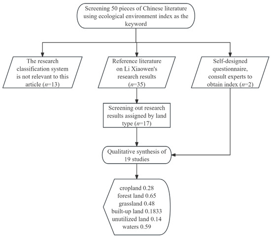 A land use change is often brought about by socio-economic and natural causes combined, which may harm social and natural environments. For example, in the process of urbanization, many croplands are converted to built-up lands, resulting in significant changes in the surface permeability, surface albedo, types and quantity of vegetation, and biological habitats, which, in turn, affect the regional precipitation, local climate, and biodiversity. Thus, alterations in the way land is utilized may directly affect the local natural ecosystem. At present, the method most commonly used to rate the EQ of land use is the Eco-Environmental Quality Index (EQI) established by Li Xiaowen et al. [43], which employs representative and accurate model parameters. This study applied a meta-analysis to determine the EQI, following the approach displayed in Figure 3.