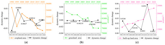 The line graph in Figure 4 depicts changes in the extent of each land use type every five years; this was utilized to assess the shifts in land use. This graph revealed that the dynamism of different land use types peaked at different time points. Cropland underwent the most significant change between 1990 and 2000, with an increase in overall dynamism followed by a reduction, producing an overall increase in cropland area. Specifically, in the period from 1990 to 1995, cropland experienced a notable decline, showing a dynamic change of −1.22%. Then, between 1995 and 2000, it underwent a modest increase, with a dynamic change of 0.88%. Following that, from 2000 to 2020, the cropland area consistently decreased, initially at an accelerating rate, which then gradually slowed. These adjustments were directly tied to the period’s urbanization and economic growth. In recent years, the Chinese government has formulated many regulations on cropland protection to address the issues of rapid industrialization and urbanization for agricultural land. These policies have reduced the rate of cropland’s transformation to other land types to an extent, but nonetheless, cropland area continues to decrease. In the future, strengthening cropland protection will be pivotal to realizing Chinese-style modernization in the transect area.