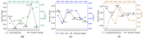 The dynamic changes in forest land fluctuated first and then stabilized. During the research period, the extent of forest land increased rapidly, with a dynamic change of 4.55%. However, between 1995 and 2000, the extent of forest land declined swiftly, with a dynamic change of −3.55%. Since entering the 21st century, China has adopted a series of policies to protect forest land and has achieved phased results. Since 2000, the dynamic change in forest land has thus had less fluctuation, and the forest land extent has slightly increased.