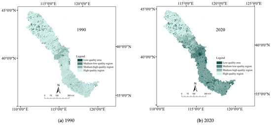 Using the natural breakpoint method, the EQ calculated was divided into four grade zones: a low-quality region, medium–low-quality region, medium–high-quality region, and high-quality region, and the spatial distribution of the EQ in the transect area in the period from 1990 to 2020 was determined, as shown in Figure 9. In this figure, the darker the color, the worse the EQ. The figure demonstrates that except for the Inner Mongolia grassland area, which had smaller changes, the overall EQ grade of all areas in the transect declined. (In the Inner Mongolia grassland zone, the ecological environment was constantly at a high quality, but the increase in unutilized land during the three decades studied led to an expansion of the scattered low-quality areas.) The overall EQ of the agricultural–pastoral intertwined area declined most clearly, decreasing from high-quality grade domination in 1990 to medium–high-quality classification domination in 2020, and the low-quality classification areas expanded significantly. The main changes in the forest zone north of Beijing and Hebei were that, in the northwest area, the high-quality classification zone declined to a medium–high-quality classification zone, and the medium–high-quality classification zone declined to a medium–low-quality classification zone. Meanwhile, in the Beijing–Tianjin–Hebei urban zone, the EQ declined by one grade. The area of the low-quality grade zone expanded significantly as compared with the medium–low-quality grade zone in the initial stage. Overall, the EQ was greatly impacted by the widespread development of built-up area. As built-up land expanded, the EQ of some areas declined from a high-quality grade zone to a low-quality grade zone. Similar to the Beijing–Tianjin–Hebei urban areas, the EQ of the Hebei–Shandong agricultural zone and the central and southern Shandong hilly zone declined by one grade, dropping from high-quality classification domination to medium–high-quality classification domination. Finally, as a result of the sprawling urbanization and expansion of rural habitation, the low-quality classification regions became fragmented and dispersed, appearing in a scattered dot pattern.