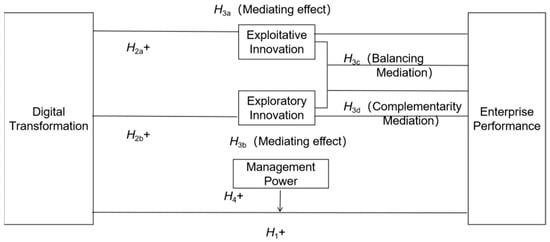 Exploitative and exploratory innovation are considered two different innovation strategies; enterprises’ survival and development must choose different innovation behaviors according to the uncertainty of the external environment and the limited internal resources. Firms with access to external resources can benefit from the complementarity of dual innovation, while firms with limited resources must focus on the balance of dual innovation [35,36]. There is a need for balance between the two types of innovation, and there will also be a degree of inclusiveness and complementarity. Dual innovation balance is the degree to which the two exploitative and exploratory innovation approaches are balanced, finding the best fit between maintaining existing strengths (exploitative innovation) and exploring future potential (exploratory innovation). Dual innovation complementarity refers to the complementary and promotional relationship between the two types of innovation. The balanced development of dual innovation can effectively activate the idle resources of the enterprise, alleviate the internal conflict brought about by the competition for resources, and realize the optimal allocation and efficient use of resources [37], and at the same time, avoid the over-reliance on exploitative innovation leading to the enterprise falling into the “innovation trap,” and avoid the over-pursuit of exploratory innovation leading to the enterprise facing the expensive R&D costs, market uncertainty, and the high costs of the future. The mutual complementation and promotion of exploitative and exploratory innovation enable enterprises to broaden their business scope, increase market share and economic benefits [38] and lay a solid foundation to obtain and consolidate their competitive advantages. Exploitative innovation can broaden the scope of the enterprise’s search for new knowledge, enhance its knowledge absorption and internalization capabilities, accumulate rich intellectual capital and capability base for exploratory innovation, and provide technical support for the reshaping of organizational structure, operational paradigm, and business processes, which helps to improve the enterprise’s operational efficiency within the existing framework. The new knowledge and technologies generated by exploratory innovation activities constitute the prerequisites for exploitative innovation activities [39]. The promotion of the innovative application of knowledge by enterprises not only contributes to the further improvement of the level of exploitative innovation but also opens up a path to satisfy the highly differentiated needs of the market, which is conducive to improving consumer stickiness and enabling enterprises to benefit from the continuous interaction and value co-creation with consumers. The deepening of digital transformation greatly facilitates the parallelism and mutual reinforcement of these two types of innovation activities, solidifying an enterprise’s position in the existing market and helping it seize the first opportunity to win a competitive advantage in the emerging market. Based on the above, the following hypotheses are proposed:
