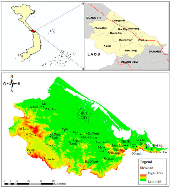 Thua Thien Hue, situated in central Vietnam, boasts a coastline of 128 km, 22,000 hectares of lagoons, and more than 200,000 hectares of forest. Thua Thien Hue province has strengths not only in heritage tourism, spiritual cultural tourism, and sea tourism but also in ecotourism associated with streams and waterfalls. Throughout the districts and towns of Thua Thien Hue, from lowlands to highlands, it is evident that there exists substantial potential for ecotourism based on streams and waterfalls. A stream is a flowing body of water that moves continuously, while a waterfall is a location of a river or stream where water flows over a steep drop. The location of Thua Thien Hue province and a terrain map is shown in Figure 1. Thua Thien Hue features a distinct hierarchical geographic structure. The region’s terrain includes mountainous areas extending from the Vietnam–Laos border to Da Nang city, covering approximately one-quarter of the total area. Midland regions make up about half of the area, with an average elevation of less than 500 m. Additionally, the local delta is characterized by sand dunes and a lagoon, encompassing around 1400 square kilometers.