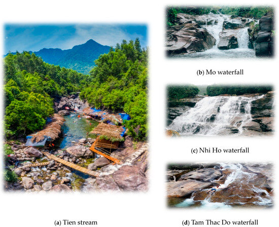 Thua Thien Hue is one of the national tourism destinations that has many tourist attractions for both domestic and international tourists. Thua Thien Hue also has plenty of streams and waterfalls forming a dense network, primarily originating from the mountainous and hilly terrain in the eastern part of the Truong Son mountain range. Due to the territorial structure, the streams and waterfalls are located 20–90 km away from the city center. In particular, most of the waterfalls have a wild and attractive beauty, such as Mo waterfall, Voi stream, Tien stream, Bo Ghe waterfall, and Nhi Ho waterfall. Among them, four streams and waterfalls have been recognized as tourist destinations. Each waterfall has a quality rarely found in other areas. Because most streams and waterfalls are remote and quite far from residential areas, the area around the waterfalls is still natural. This supports ecotourism because most of the ecotourism objectives concern the authenticity and uniqueness of the tourist attraction [27]. However, the development of ecotourism in streams and waterfalls in Thua Thien Hue province has encountered some difficulties, such as most of the locations being located in remote areas. It is not easy to get there, and there are not many support services like accommodation, shopping, etc. Given the area’s own strengths and unique characteristics, developing ecotourism around streams and waterfalls is one of the directions that Thua Thien Hue province has been focusing on and will continue to exploit. The district’s People’s Committee also has programs and solutions to attract and call on investors to develop ecotourism in streams and waterfalls.