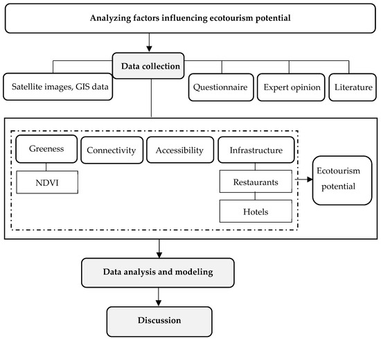 To identify the factors influencing ecotourism potential, firstly GIS data required for this research were acquired from various sources. Administrative boundary maps, road networks, and satellite imagery were used for connectivity and identification of infrastructure such as restaurants and hotels.