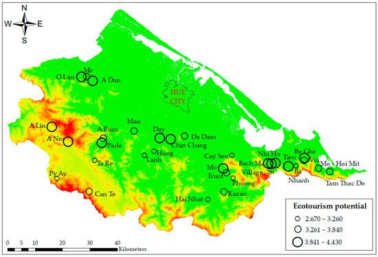 Ecotourism potential in streams and waterfalls in Thua Thien Hue province, which scored from 2.67 to 4.43, was categorized into three classes (low, moderate, and high). The results showed that the high-ecotourism-potential class comprised Mo waterfall, Bach Ma village (Truot waterfall), Chin Chang waterfall, O Lau stream, Nhi Ho waterfall, Su stream, A Nor waterfall, Parle stream, Day stream, Bo Ghe waterfall, A Lin stream, A Don waterfall, and Tien stream. The moderate class comprised Can Te stream, Mo – Hoi Mit stream, Mau stream, Da Dam waterfall, Voi stream, A Rum stream, Tam Thac Do waterfall, Kazan waterfall, Me stream, and Truot waterfall. The low-ecotourism-potential class comprised Hung stream, Lanh stream, Ta Re waterfall, Hai Nhat waterfall, Py Ay stream, Ba Nhanh stream, Phuong waterfall, and Cay Sen waterfall (Figure 4).