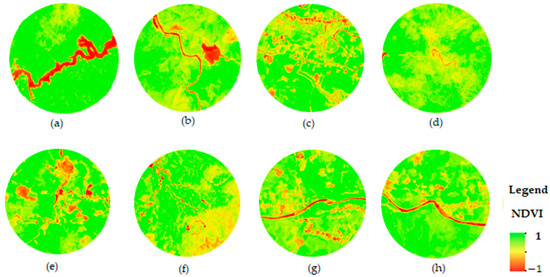 NDVI images for eight waterfall and stream areas within a 1 km buffer in Thua Thien Hue province: (a) Lanh stream; (b) Chin Chang waterfall; (c) A Don waterfall; (d) Hung stream; (e) Mau stream; (f) Ta Re waterfall; (g) Me stream; (h) O Lau stream.
