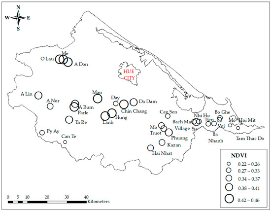 Average NDVI levels around waterfalls and streams in Thua Thien Hue province.