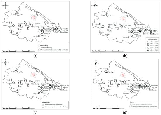 (a) Connectivity, (b) accessibility, (c) restaurants, and (d) hotels around waterfalls and streams of Thua Thien Hue province.