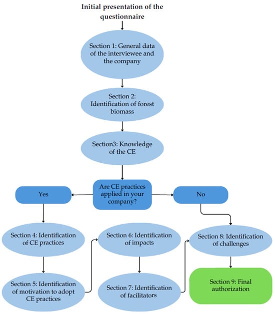 The structure of the questionnaire followed a logical sequence, as demonstrated in the flowchart in Figure 1, to enable a coherent, clear, and direct line of reasoning for the interviewees, with closed- and open-ended questions to ensure a wide range of responses and insights. The items were organized sequentially into nine distinct sections: