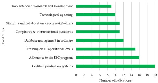 Regarding facilitators, the data analysis revealed that certified production systems stand out as the most significant facilitator for companies, followed by adherence to the Environmental, Social, and Governance (ESG) program (Figure 2). Other important facilitators include training on all operational levels, database management in software, collaboration among stakeholders, and compliance with international standards, although with fewer indications.