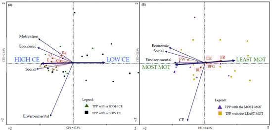 The TPPs were also grouped according to the level of motivation for the implementation of the CE (in MOST and LEAST motivated). Again, the data reveal that the most motivated companies were those that implemented the most CE practices and perceived more significant impacts as a result of implementation. In Figure 3B, the arrows representing the perceived impacts due to the adoption of circular practices (economic, social, and environmental), as well as circular practices (CE), show the same direction as the group of TPPs with a high level of motivation (MOST MOT). In addition, TPPts fueled by firewood (FW) and black liquor (BL) were more associated with motivation, whereas those fueled by forest residues (FR) were the least motivated.