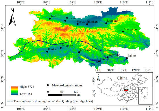 The study area covers a series of ancient fold-fault mountains extending from east to west in Central China [26,27]. The highest peak, Mount Taibai, reaches an elevation of 3771.2 m. Mts. Qinling is widely recognized in China as a critical geographical divider [10], influencing not only regional ecological variances, production, and lifestyle between the North and South [28] but also serving as the demarcation line between the north subtropical zone and the warm temperate zone [29]. This boundary separates the humid regions to the North from the semi-humid regions in the South and includes the 800 mm annual precipitation isotherm and the mean January temperature 0 °C isotherm [30]. As a key geological and ecological transition zone in the Chinese Mainland, Mts. Qinling are characterized by its environmental complexity, biodiversity, and climate sensitivity. It significantly influences China’s geographical patterns, the evolution of biotic communities, and the distribution of natural resources [31,32,33]. Based on the divisions established by Chen Quangong’s research group regarding the Qinling–Huaihe line, the study region is bifurcated into northern and southern sections for comparative analysis, spanning Gansu Province, Shaanxi Province, and Henan Province, with a particular emphasis on Shaanxi Province [29,34]. The twelve meteorological stations utilized in this study are evenly distributed across the northern and southern parts of Shaanxi Province (see Table 1 and Figure 1 for detailed information).