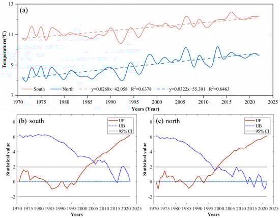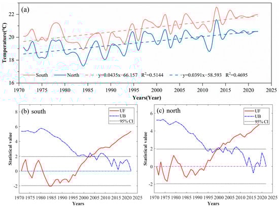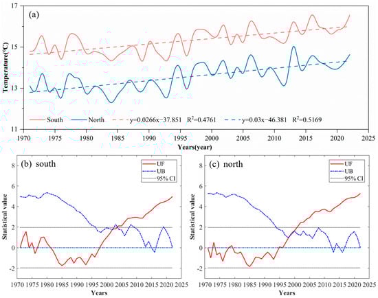 Variation trend and M–K mutation test of annual mean temperatures between South and North Mts. Qinling. (a) Variation trend of annual mean temperatures; (b) M–K mutation test of annual mean temperatures in the South; (c) M–K mutation test of annual mean temperatures in the North.