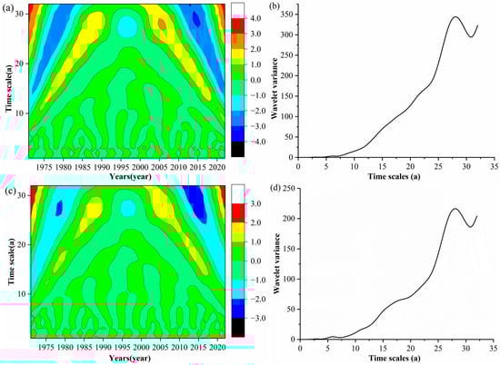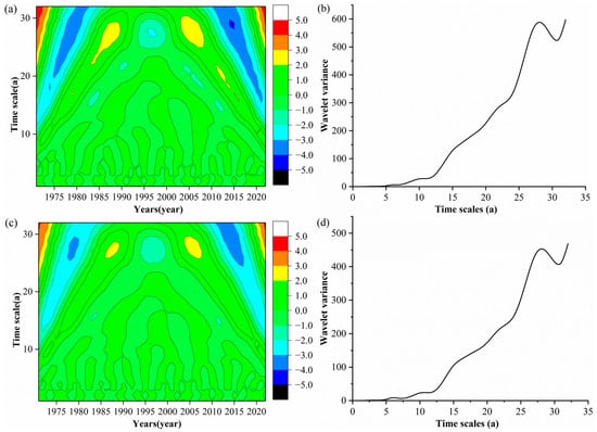 Periodic distribution of annual maximum temperatures between the South and North Mts. Qinling based on Morlet wavelet analysis. (a) Wavelet coefficient real part isoline in the South; (b) wavelet variance in the South; (c) wavelet coefficient real part isoline in the North; (d) wavelet variance in the North.