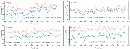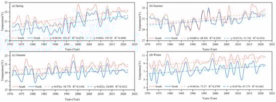 Figure 8, which utilized daily maximum temperature data, illustrates the average temperature variations across the four seasons in both the northern and southern regions of the Mts. Qinling. The overall pattern mirrored that observed with daily mean temperature variations, particularly highlighting a stark contrast between spring–winter and summer–autumn. Notably, the highest temperature change rates occurred in spring, with the North experiencing a slightly higher rate of 0.640 °C/10a compared to 0.619 °C/10a in the South. Winter followed, displaying the second-highest change rates at 0.374 ℃/10a in the North and 0.416 °C/10a in the South. In contrast, the temperature increase rates during the summer–autumn seasons were significantly lower in both regions. Specifically, during spring, the North consistently exhibited higher warming rates than the South. Overall, temperatures were rising in all four seasons across both the South and North Mts. Qinling. However, the South demonstrated a higher rate of temperature increase during the summer, autumn, and winter compared to the North. This trend reinforces the observations from earlier sections (as seen in Figure 6a) and helps clarify the growing temperature disparity between the two sides of Mts. Qinling.